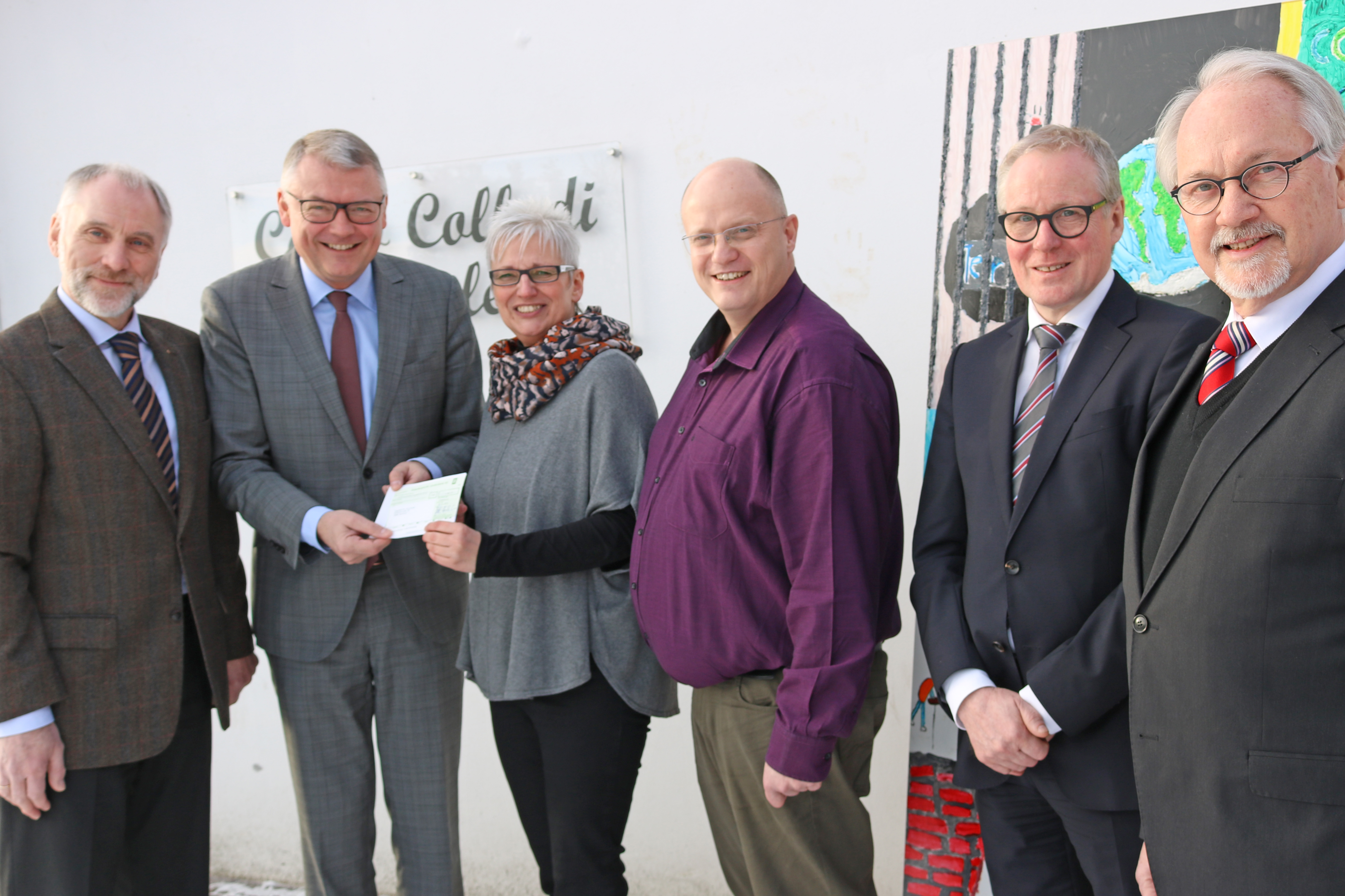 Westerstede-Linswege, 17.01.2017 - Aus Anlass des Oldenburger Schlossabend haben die Mitglieder der Wirtschaftlichen Vereinigung - DER KLEINE KREIS für soziale Einrichtungen gesammelt. Jetzt konnten Geschäftsführer Jürgen Lehmann und Vorstandsvorsitzender Martin Steinbrecher (v.li.) 7.000 Euro an Gerlind Bredemeyer, Schulleiterin der Carlo-Collodi-Schule und Jan Prassel, Leiter der Diakonie Jugendhilfe übergeben. Mit dabei Diakonievorstand Thomas Feld und Prof. Dr. Heinz-W. Appelhoff. In der Carlo-Collodi-Schule werden Kinder und Jugendliche beschult, die in anderen Schulen durch starke Lerndefizite oder durch ihr Verhalten auffällig wurden. Zum Abschluss der 9.Klasse erwerben die meisten der Carlo-Collodi-Schüler einen Abschluss. Einige schaffen sogar den Übergang zum Gymnasium freut sich Bredemeyer. Bei allen Schülern geht es um die Vorbereitung auf eine spätere Berufsausbildung. Da ist die Spende des KLEINEN KREISES sehr willkommen. Die Carlo-Collodi-Schule will einen digitalen Klassenraum einrichten, um die Schüler besser auf das Berufsleben vorzubereiten. Dort kommt heute kaum ein Arbeitsbereich ohne Computer aus, wissen die Vertreter regionaler Wirtschaftsunternehmen. 126 Kinder und Jugendliche werden an den verschiedenen Standorten der Carlo-Collodi-Schule von 20 Lehrkräften unterrichtet und von 17 pädagogischen Mitarbeitenden betreut, erläutert Jugendhilfe-Leiter Jan Prassel. In den kleinen Lerngruppen der Carlo-Collodi-Schule können die Kinder und Jugendlichen intensiver betreut und gefördert werden. Die Welt der Schüler ist längst digital, weiß Bredemeyer. Viele soziale Kontakte bestehen in der digitalen Welt. Leider kennen viele Schüler aber auch unangenehme Seiten der Digitalisierung wie Mobbing. Die Schule will dem nun positive Erfahrungen entgegensetzen, einen angemessenen Umgang mit dem Medium lehren und den Schülern die Möglichkeit geben, weitere Kompetenzen zu erwerben. Es gehört zur guten Tradition der Wirtschaftlichen Vereinigung Oldenburg, beim Schlossabend für karitative Zwecke zu sammeln. Rund 31.500 Euro kamen so Anfang Dezember 2016 zusammen. Am Schlossabend treffen sich alljährlich Vertreter aus Wirtschaft, Politik, Kirche und Verwaltung, um den Vortrag eines prominenten Gastes zu hören. In Dezember vergangenen Jahres sprach Verteidigungsministerin Dr. Ursula von der Leyen.