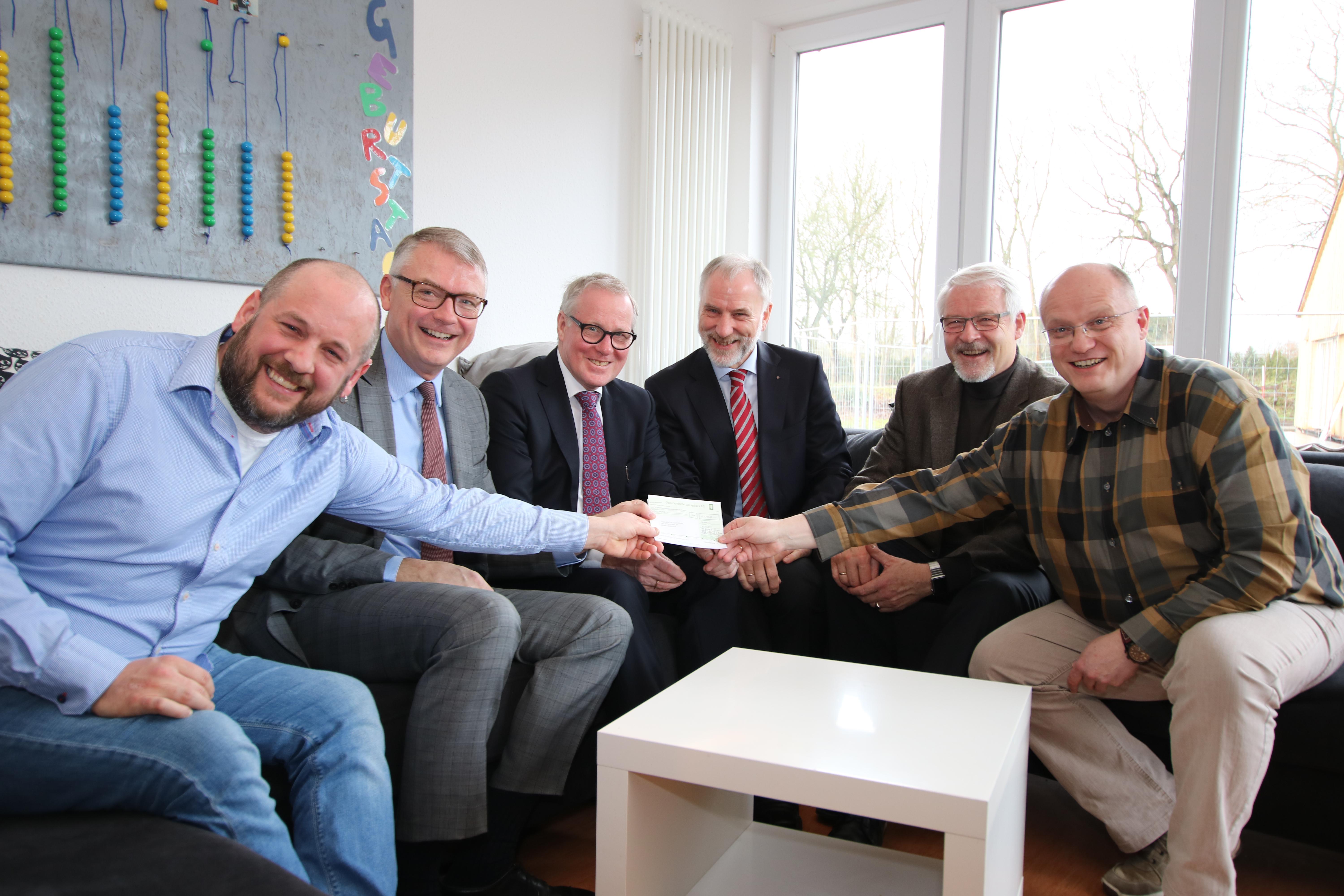 Grabstede, 16. Jan. 2018 – Rund 30.000 Euro hat die Wirtschaftliche Vereinigung der kleine Kreis anlässlich des Schlossabends im Dezember für karitative Zwecke gesammelt. 7.100 Euro haben jetzt Geschäftsführer Jürgen Lehmann und der Vorstand des Kleinen Kreises an die Diakonie-Jugendhilfe Collstede übergeben. Das Geld wird verwendet, um die Außenanlagen der der heilpädagogischen Jungen-Wohngruppe neu zu gestalten. In der von Gruppenleiter Till Waschek liebevoll als Butschergruppe bezeichneten Einrichtung leben zur Zeit sieben Jungen im Alter zwischen 9 und 16 Jahren. Sie brauchen Bewegungsraum und einen Ausgleich zur Schule. Denn die Jungen leben in einer Einrichtung der Jugendhilfe, weil schwierige Lebensumstände zu Hause das erfordern. Oft haben die Eltern um Unterstützung bei der Erziehung gebeten. Manchmal ist der Anstoß, Hilfe zu suchen, von der Schule gekommen. In der heilpädagogischen Jugendgruppe finden die Jungs einen geschützten Raum, in dem sie wachsen und ihre Lebenssituation sortieren können. Der Kontakt zur Herkunftsfamilie wird intensiv gepflegt, berichtet Einrichtungsleiter Jan Praßel. Wenn möglich ziehen die Jungen wieder zu ihren Eltern zurück. Bei den älteren Jugendlichen geht es aber meist um Verselbständigung. Denn mit 18 Jahren läuft die Unterstützung durch die Jugendhilfe aus. Wer bis dahin einen Schulabschluss geschafft und selbständig genug ist, sein Leben in einer eigenen Wohnung zu organisieren, hat gute Perspektiven für die Zukunft, wissen die Pädagogen und Sozialarbeiter der Diakonie.