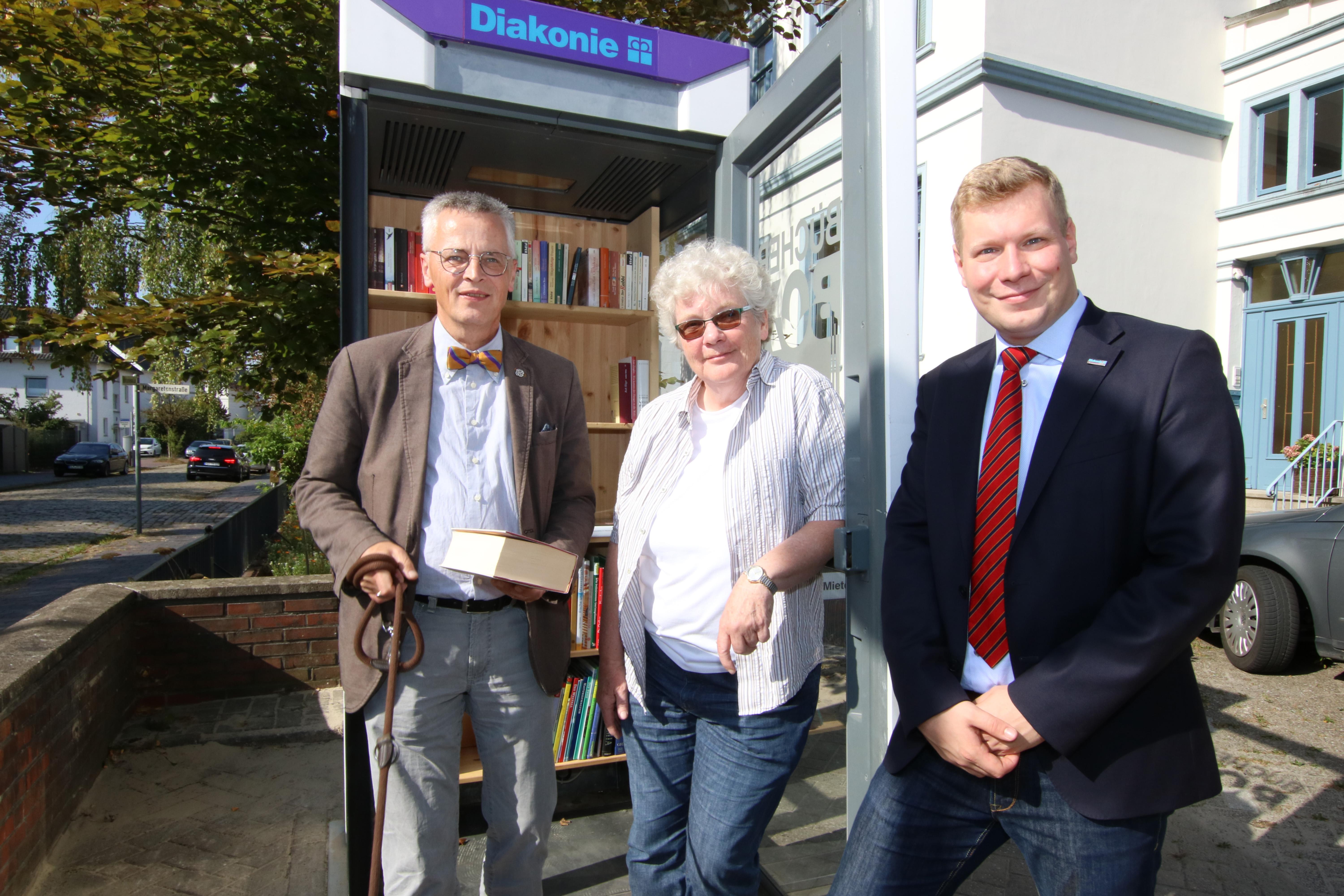Oldenburg, 19.09.2018 – Auf Anregung von Anwohnerin Ulla Meyer hat die Diakonie eine gebrauchte Telefonzelle erworben und als Büchertauschbox eingerichtet. Diakonie-Vorstand Uwe K. Kollmann hat den bisher ungenutzten Platz am Bürgersteig zur Kastanienallee gerne für das Bücherbox-Projekt freigegeben. Die Diakonie hat die Kosten von rund 3.500 Euro für den Kauf, die Aufstellung und die Einrichtung der Bücherbox übernommen und die Zelle mit Licht ausstatten lassen. Dann können Anwohner, Besucher und Mitarbeitende auch in der kommenden dunklen Jahreszeit Bücher tauschen, erklärt der Assistent des Vorstandes, Benjamin Wehage. Die Bücherbox wird ganztags offen bleiben, kündigt Kollmann an. Wir werden die Bücherbox vor unserer Tür natürlich im Auge behalten. Aber auch Ulla Meyer hat sich vorgenommen, regelmäßig nach dem Rechten zu sehen. Denn die Bücherbox soll sich als attraktive Tauschmöglichkeit vor dem Haus der Diakonie etablieren.