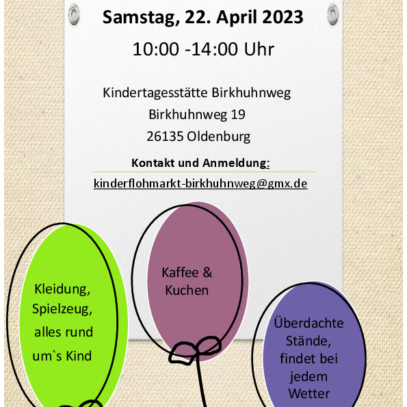 13.4.2023 – Gleich zwei Diakonie-Kindertagesstätten laden am Sonnabend, 22.04.2023 zum Flohmarkt in ihre Räumlichkeiten ein. Von 10 bis 14 Uhr haben Schnäppchenjäger in der Kindertagesstätte Birkhuhnweg, Birkhuhnweg 19, die Möglichkeit, alles rund ums Kind zu erwerben. Angeboten werden unter anderem Kleidung und Spielzeug. Außerdem werden Kaffee und Kuchen angeboten. Die Stände des Flohmarkts sind überdacht, so dass dieser bei jedem Wetter stattfinden kann.