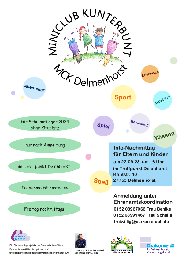 Der Miniclub Kunterbunt ist ein Ehrenamtsprojekt des Diakonischen Werks Delmenhorst/Oldenburg-Land e.V. in Kooperation mit den Integrationslotsen unter der Schirmherrschaft von Deniz Kurku.