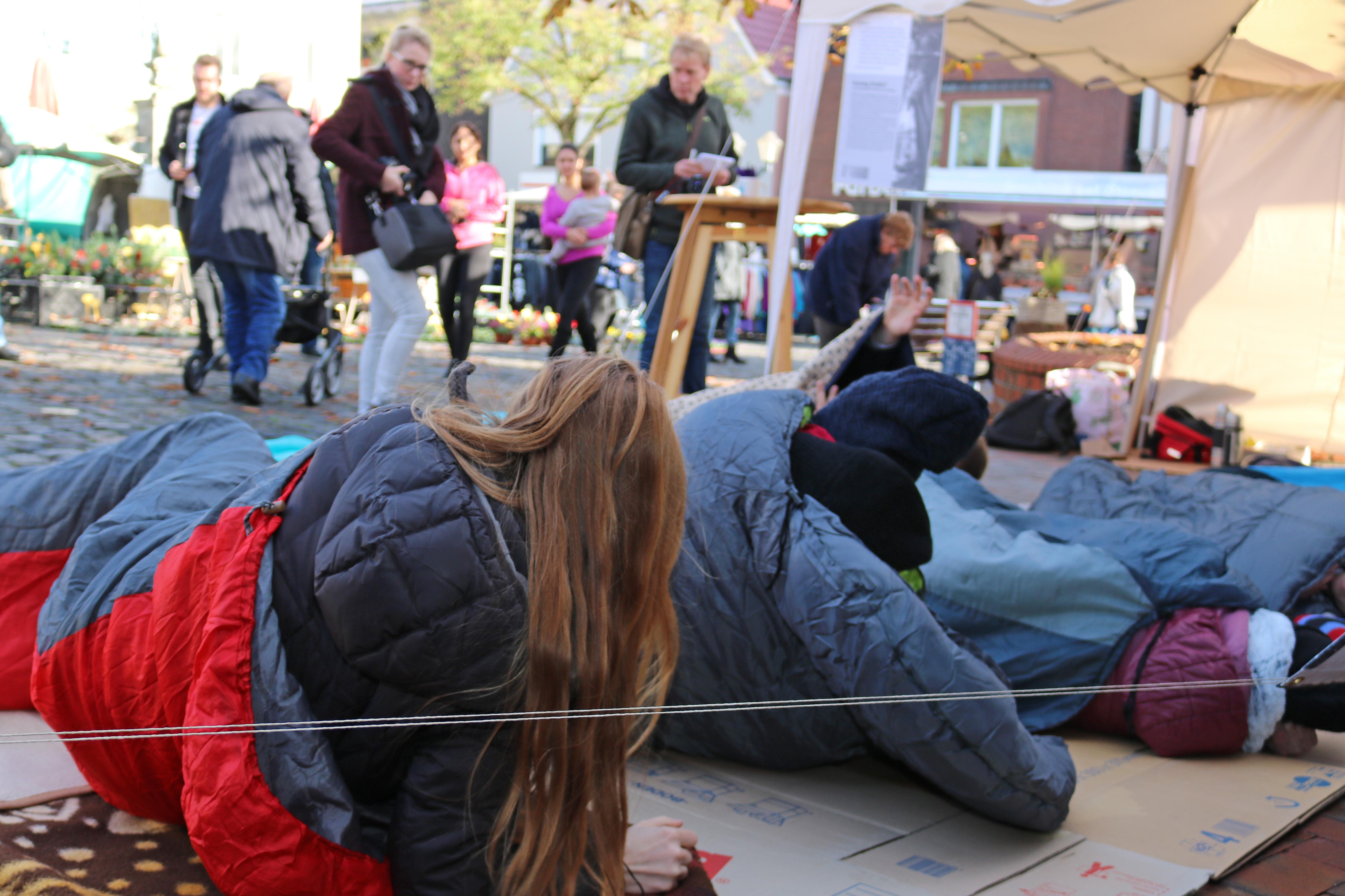 Wildeshausen, 08.11.2018 - Der Pfiff einer Trillerpfeife gellt über den Wildeshauser Marktplatz. Einige Menschen beginnen ihre Sclafsäcke auszupacken und legen sich vor das gotische Backsteinportal des Wildeshauser Rathaus. Einige Zeit später beendet ein weitere Pfiff das skurile Schauspiel.