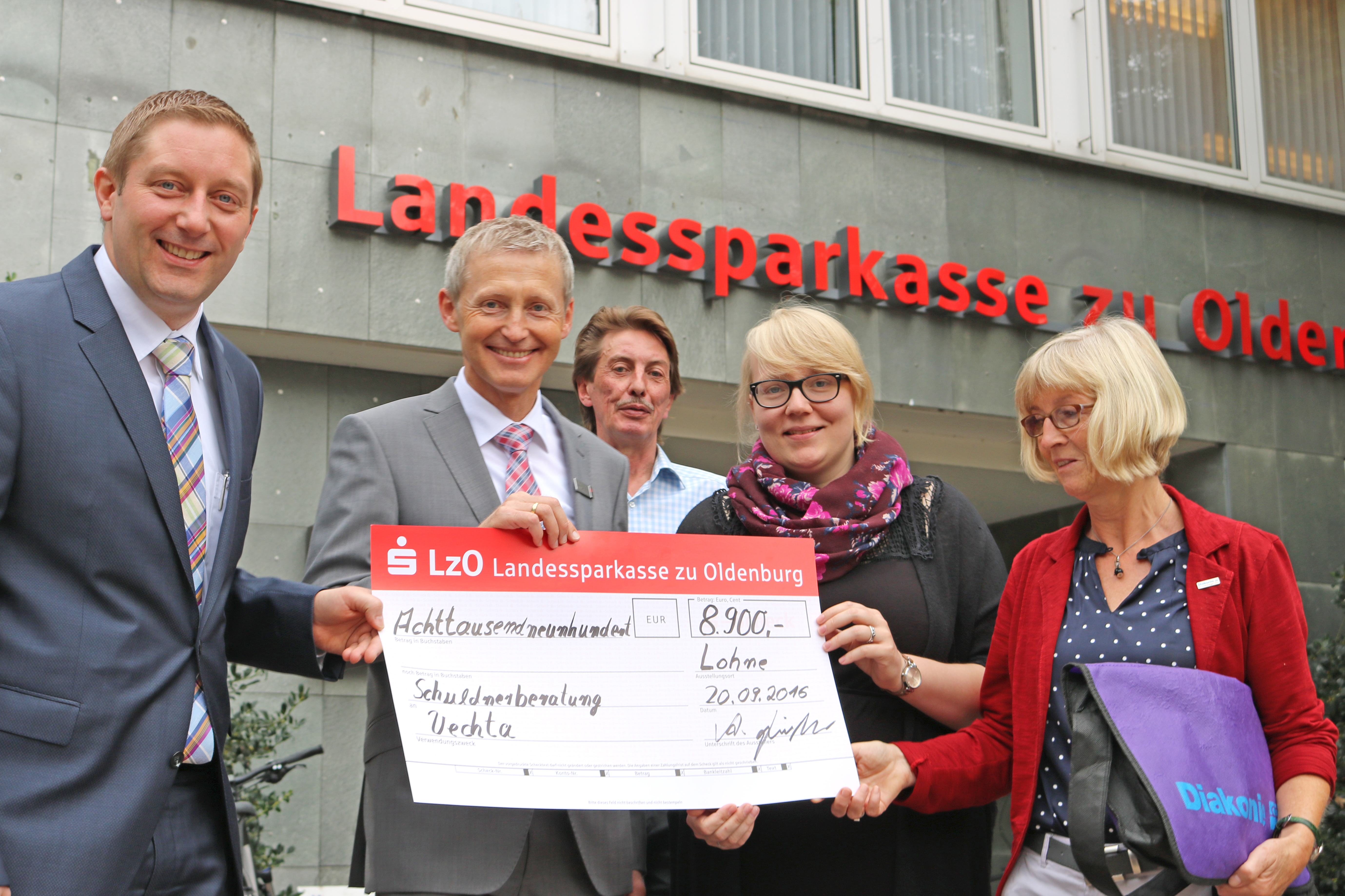 Vechta, 20. Sept. 2016 – Gemeinsam mit dem Sparkassenverband Niedersachsen unterstützt die Landessparkasse zu Oldenburg in diesem Jahr die Schuldnerberatungsstelle des Diakonischen Werkes in Vechta erneut mit einem Betrag von 8.900,- Euro, aus Mitteln des Lotteriespiels „Sparen + Gewinnen“. Hintergrund ist eine langjährige Vereinbarung zwischen den Sparkassen und dem Land Niedersachsen.