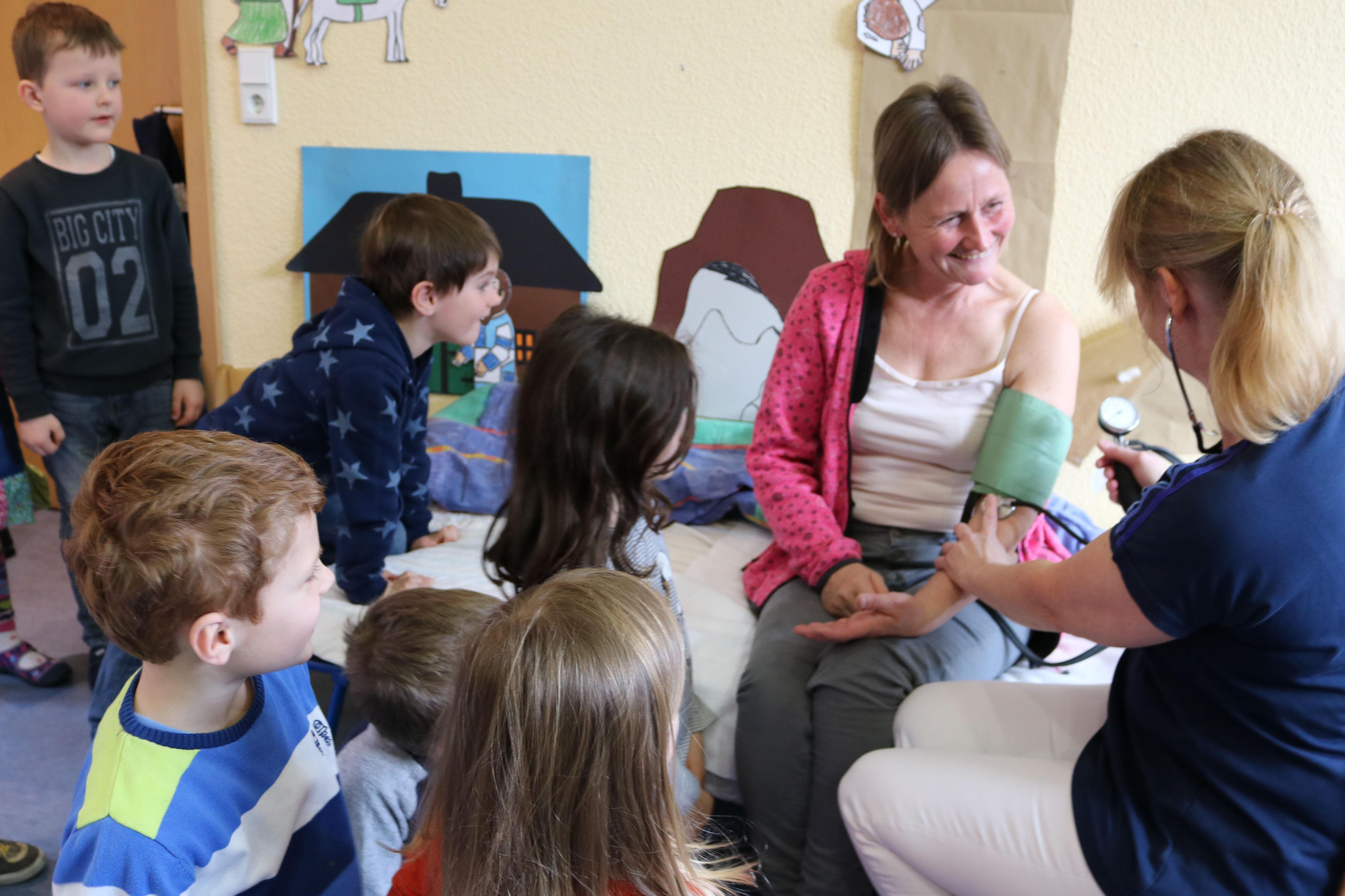 Großenkneten, 20.2.2018 – „Ist das eine echte Spritze?“ Gleich mehrere Kinder stellen diese Frage, als Pflegefachkraft Katja Grehn bei ihrer Kollegin Dagmar Siegel-Kultermann eine Spritze ansetzt. Die beiden Mitarbeiterinnen der Diakonie-Sozialstation sind im Rahmen der Bibelwoche zu Besuch im Evangelischen Kindergarten Regenbogenland in Großenkneten. Sie zeigen den Jungen und Mädchen ganz anschaulich, was es bedeutet, einen Menschen zu pflegen.