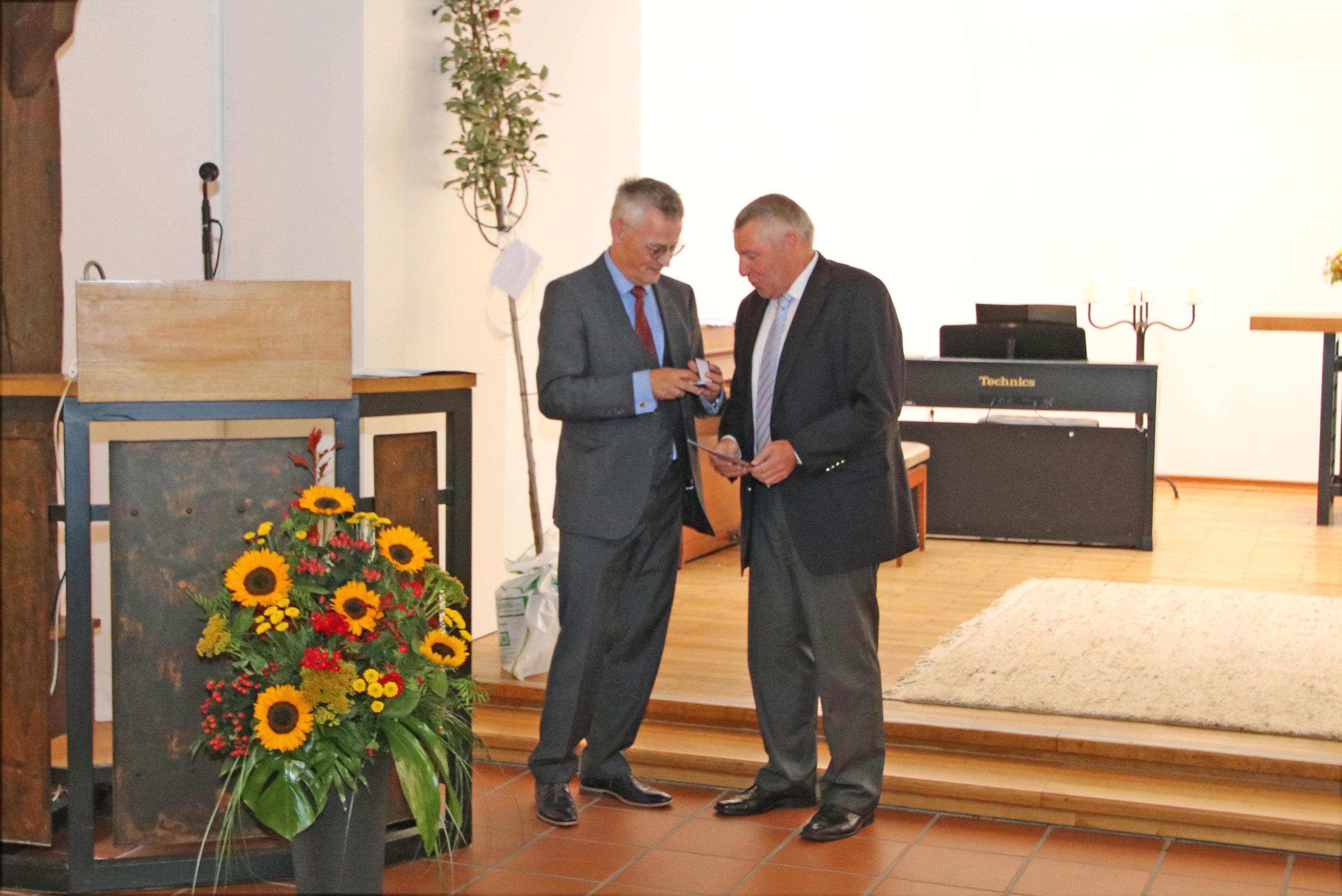 Ganderkesee, 03.09.2018 – Mit dem Goldenen Kronenkreuz ist Wolfgang Walter ausgezeichnet worden. Der Wichernstift-Vorstand Walter habe durch sein großes Engagement und der ganzen Wucht seiner Persönlichkeit das Wichernstift aus schwierigen Zeiten herausgeführt, sagte Diakonie-Vorstan Uwe K.Kollmann bei der Verelihung. Mit Mut, Flexibilität und Zuversicht sei Walter für die Menschen und die Mitarbeitenden da. Das Kronenkreuz ist die höchste Auszeichnung der Diakonie. Es wird vergeben im Auftrag des Präsidenten der Diakonie in Deutschland.