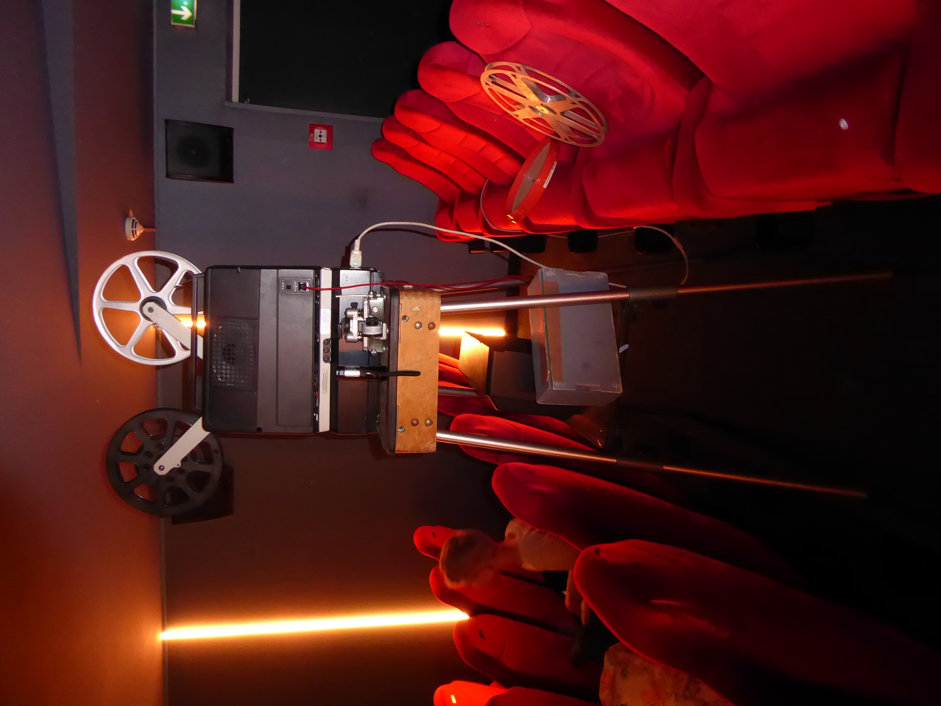 Oldenburg, 08.06.2023 - Einen eigenen Film haben die Kinder vom Club der Großen im Cine K im Rahmen des "Mini Film Clubs" gestaltet. Auf eine herkömmliche, leere Filmspule entlang malten die Kinder zuvor lange Striche. Beim Abspielen des Films wurde ihnen verdeutlicht, wie die Striche, auf eine Leinwand projiziert, einen laufenden Film ergeben.