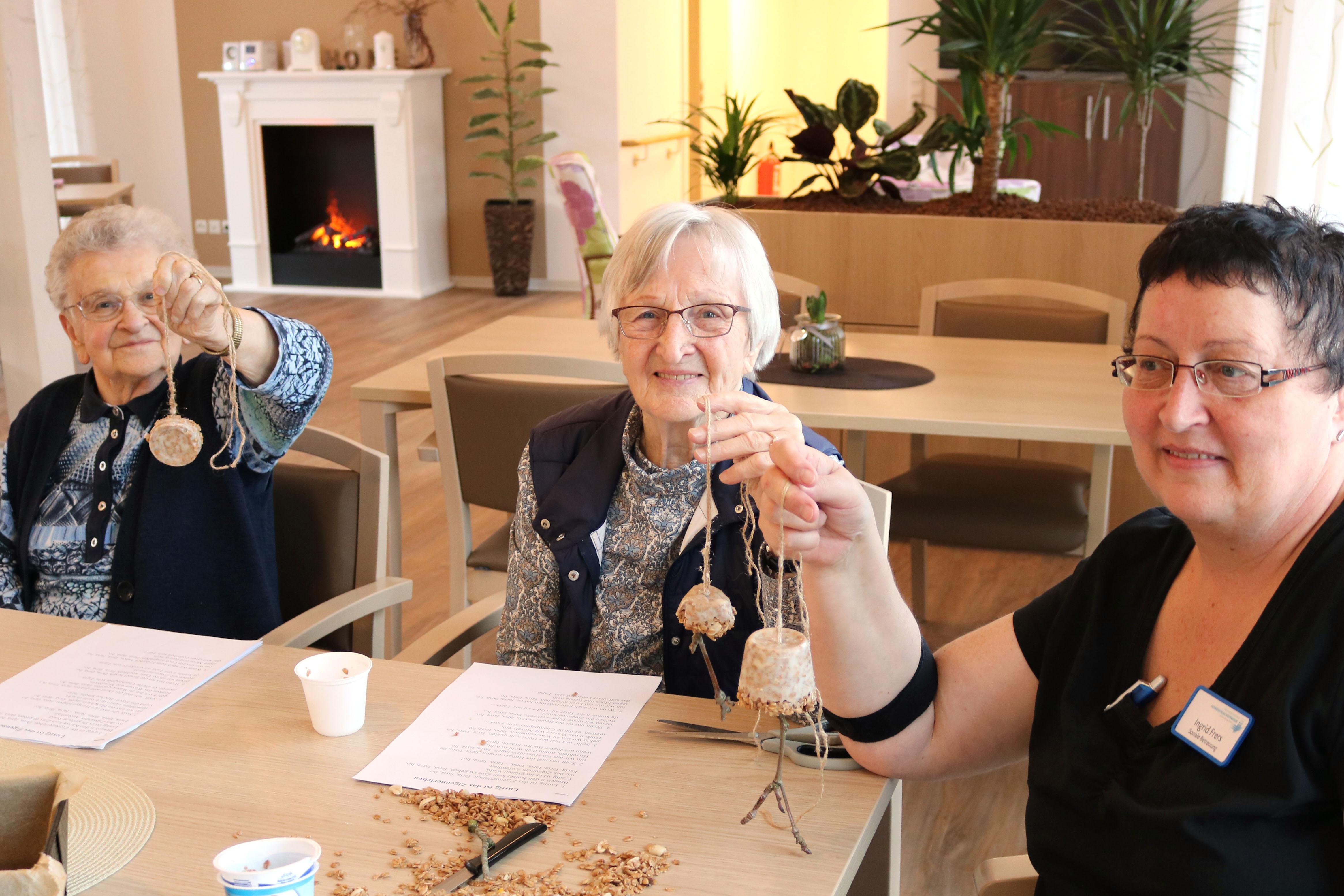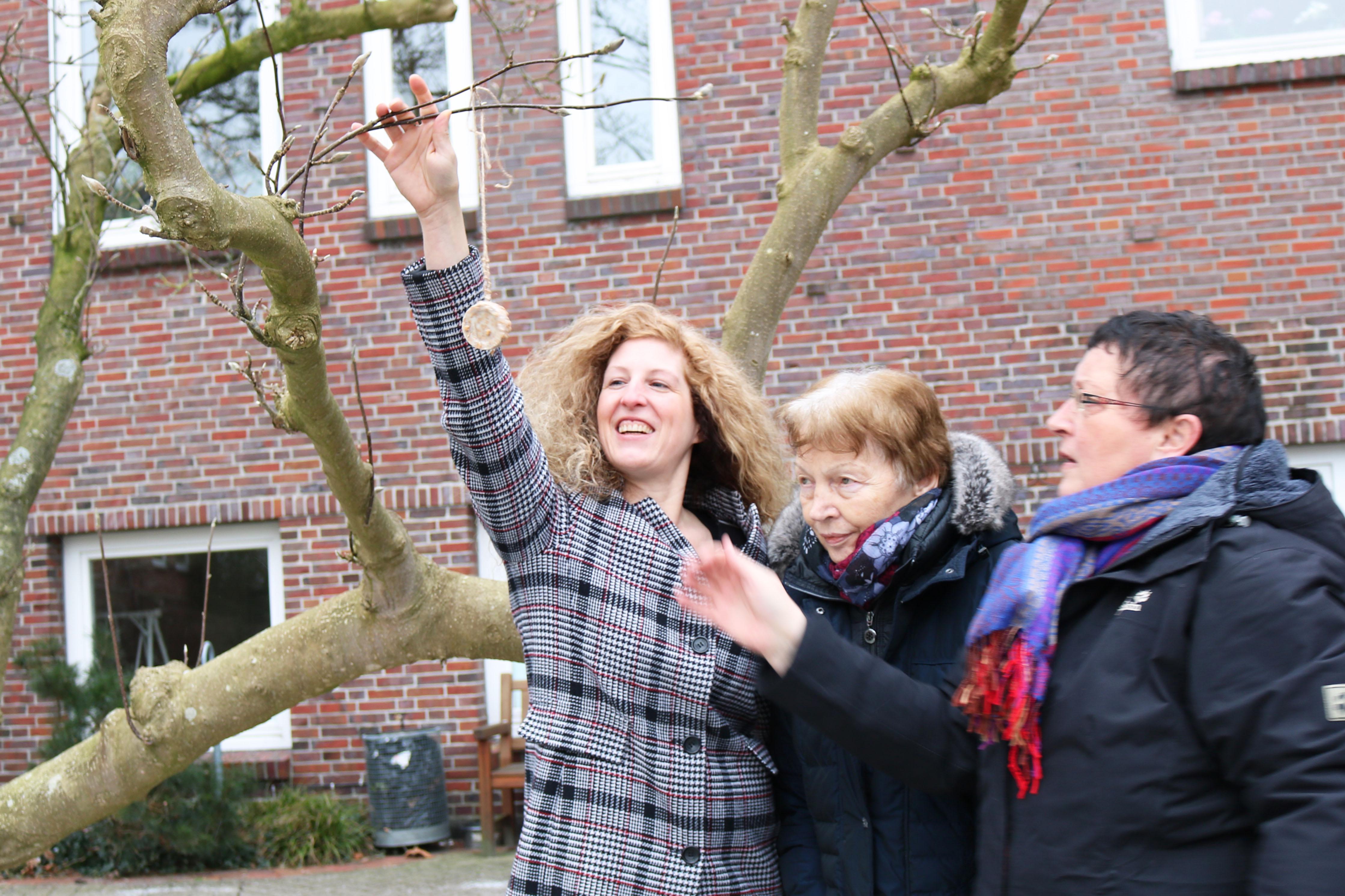 Westerstede, 24.1.2019 – „Der Ast ist gut.“ Entschlossen zieht die 92-jährige Helene Hamjediers den dünnen Ast nach unten. So kann Ingrid Frers die selbst gemachte Vogelfutterkugel anhängen. Frers arbeitet als Betreuungskraft in der Tagespflege an der Grünen Straße. Gemeinsam mit den Seniorinnen und Senioren hat sie das Vogelfutter hergestellt. Nun wird es gemeinsam im Außengelände zwischen Tagespflege und Evangelischem Altenpflegezentrum verteilt.<o:p></o:p>