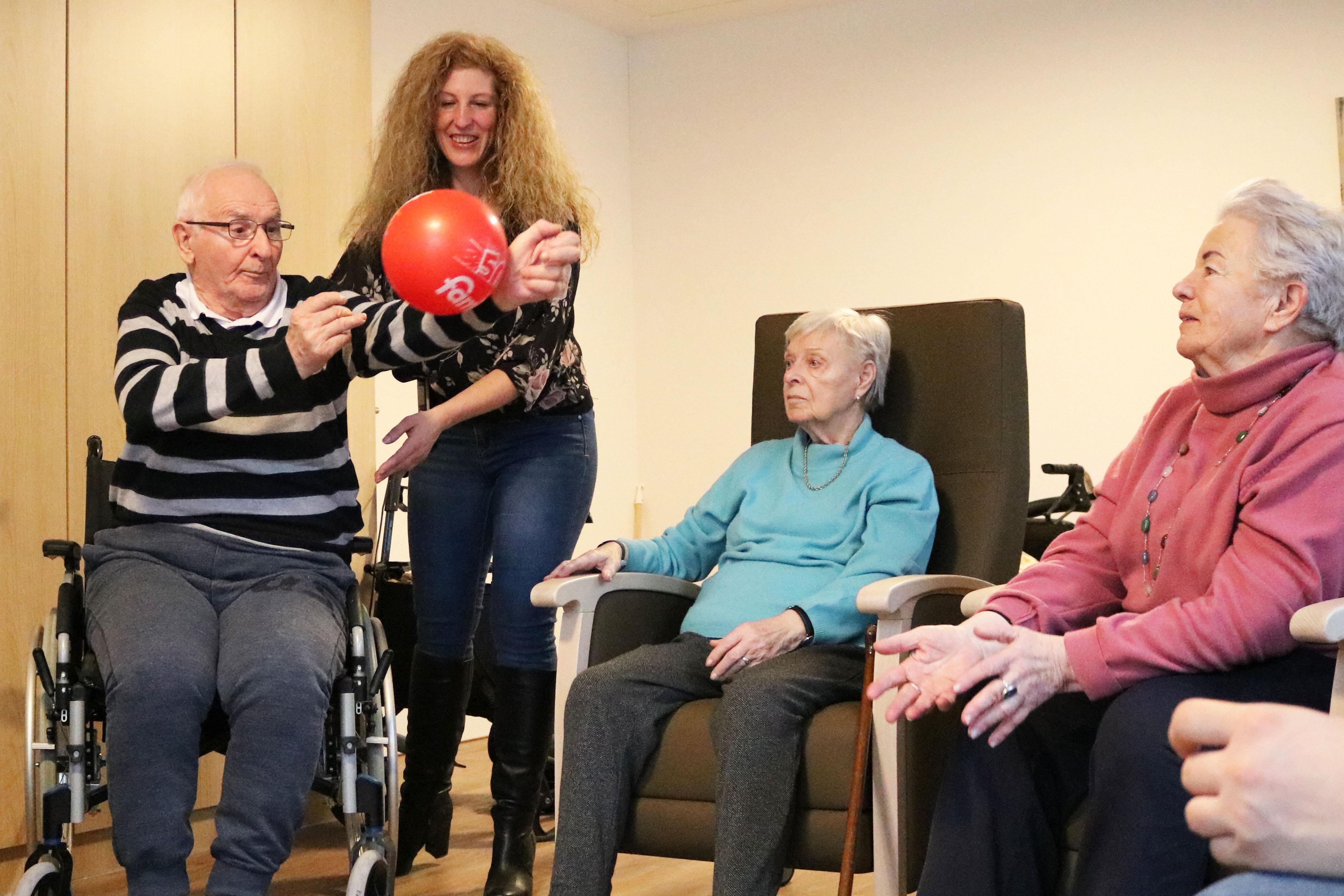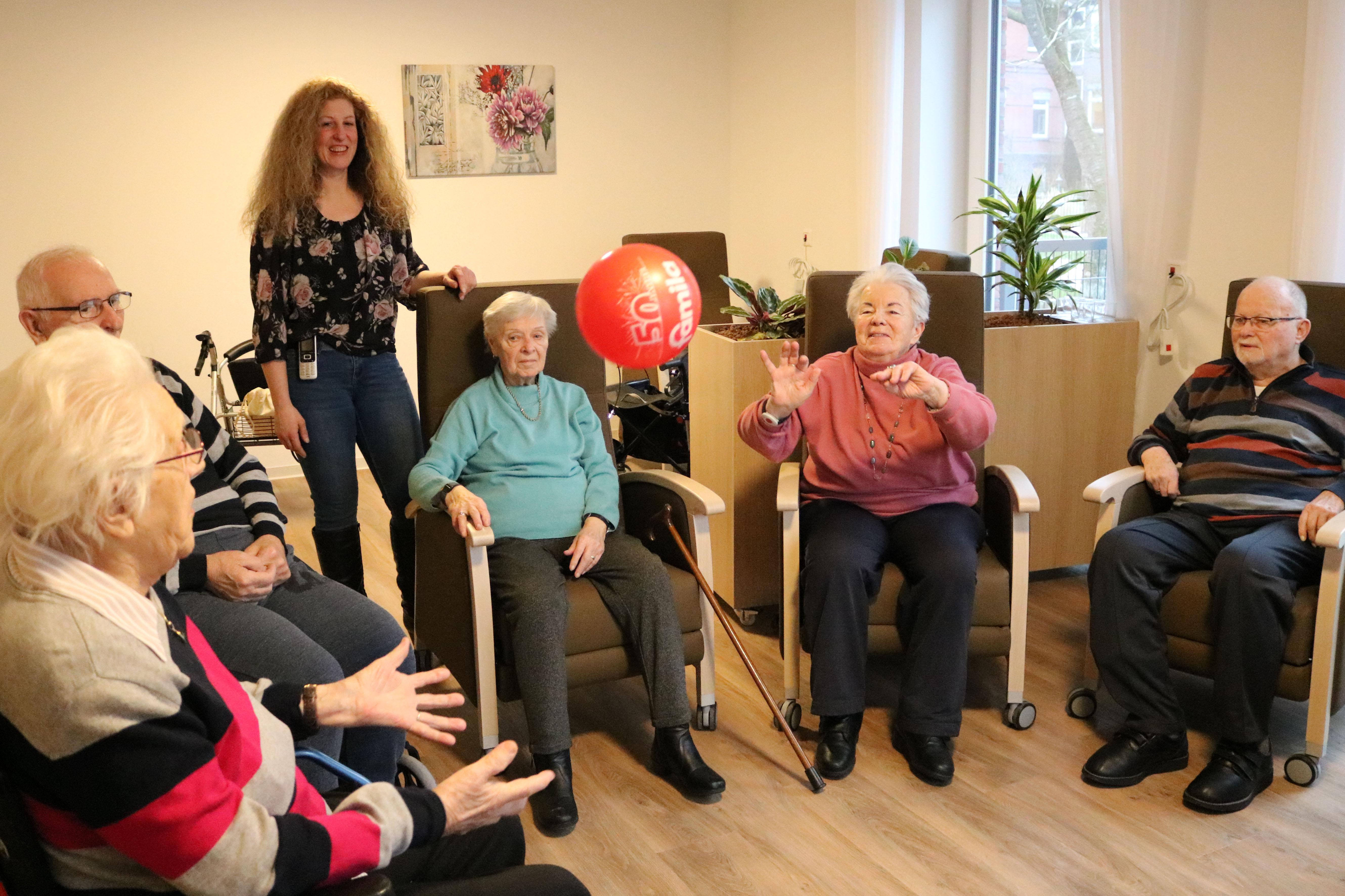Während die eine Gruppe im Außengelände das Vogelfutter verteilt, wird drinnen Morgengymnastik angeboten. Das Küken der Runde ist an diesem Tag 78 Jahre alt. Theda Saathoff ist die Älteste in der Runde. „Mit 96 Jahren habe ich endlich Zeit zum Spielen“, scherzt sie, während ein roter Gummiball von einem zum anderen geworfen wird. Durchaus mit Ehrgeiz. „Ob ich das schaffe“, fragt Saathoff und wirft dann zielgerichtet zu Melanie Friedrichs. Die Pflegehilfskraft gestaltet die Gymnastik mit den Senioren. <o:p></o:p>