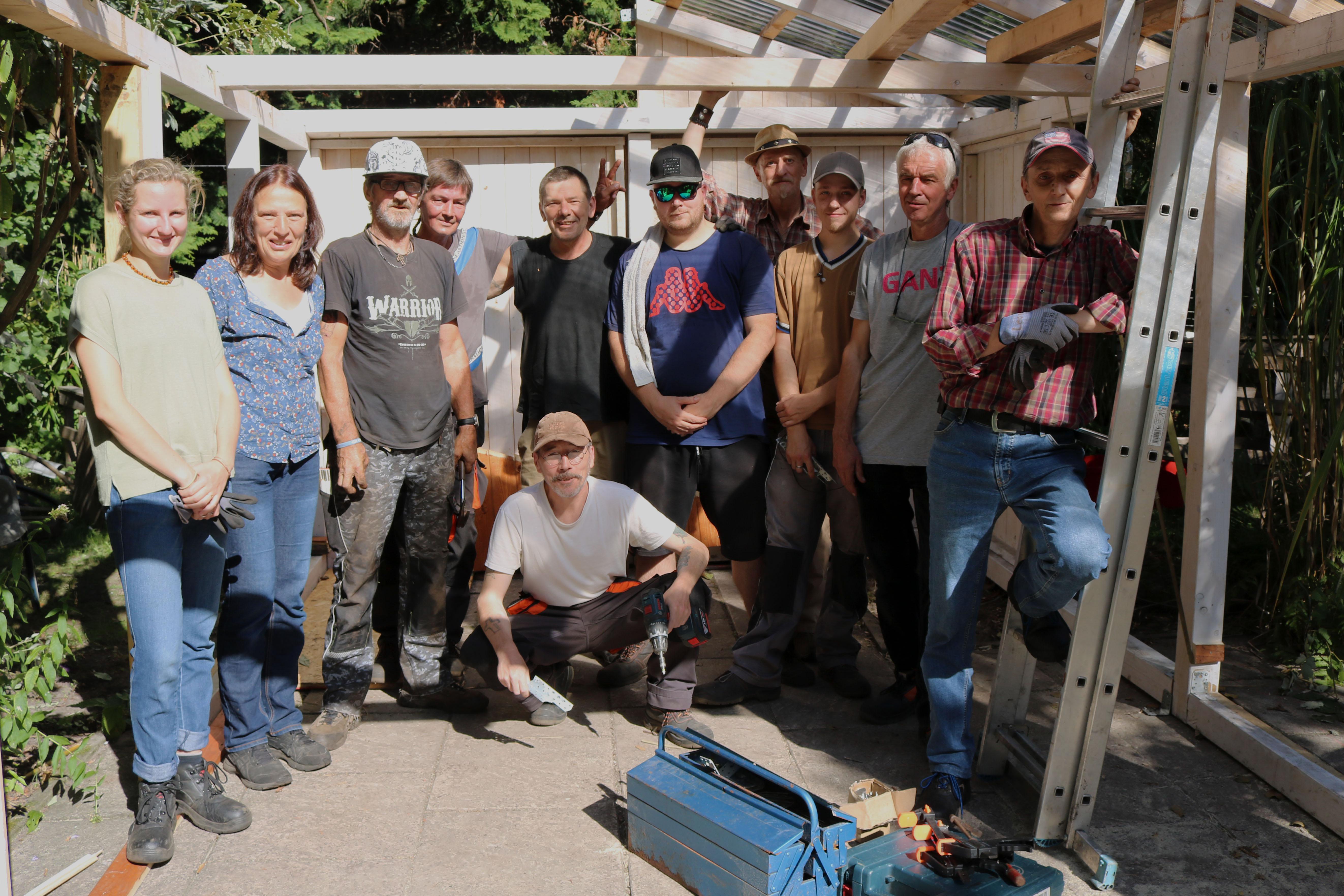 Seit zwei Wochen ist das Team von Querbeet nun wieder an fünf Tagen in der Woche auf der 1600 Quadratmeter großen Parzelle. Es wird geerntet, Unkraut gezupft und gebaut. Für den Herbst und Winter wird der Anbau der abgebrannten Laube als vorläufiger Aufenthaltsraum an einer neuen Stelle aufgebaut. Folkert Waldeck, einer der zwei Handwerker im Team, hat diese Aufgabe gemeinsam mit mehreren Teilnehmern übernommen. Erst danach kann eine Fachfirma mit dem Abriss der Brandruine beginnen. Und auch die Stelle für die neue Laube wird schon vorbereitet.