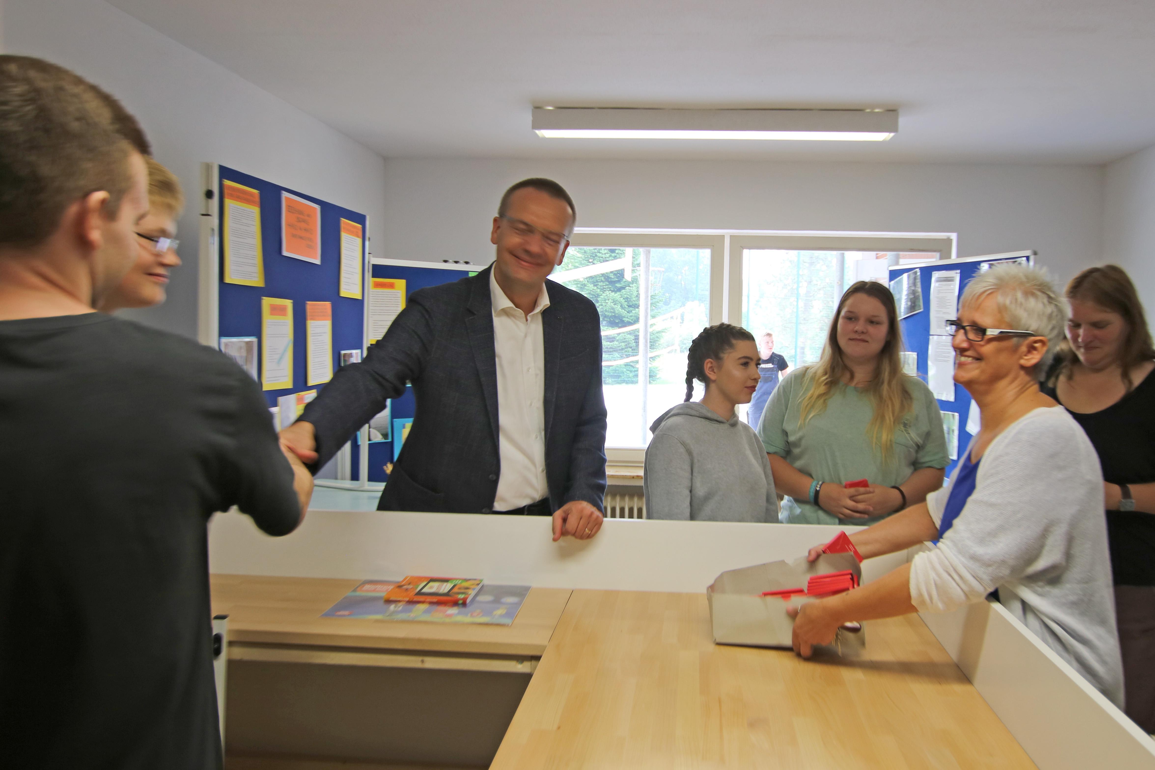Linswege, 19. Sept. 2018 - Sonst drängen sich im Schülerladen der Carlo-Collodi-Schule die Mitschüler, um ein Stück selbst gebackene Pizza zu ergattern. Heute ist Oberkirchenrat Thomas Adomeit zu Besuch. Er will sehen, wie die Carlo-Collodi-Schule ihr Prinzip umsetzt, das jedes Kind eine Chance verdient, sich seinen Platz in der Gesellschaft zu suchen.