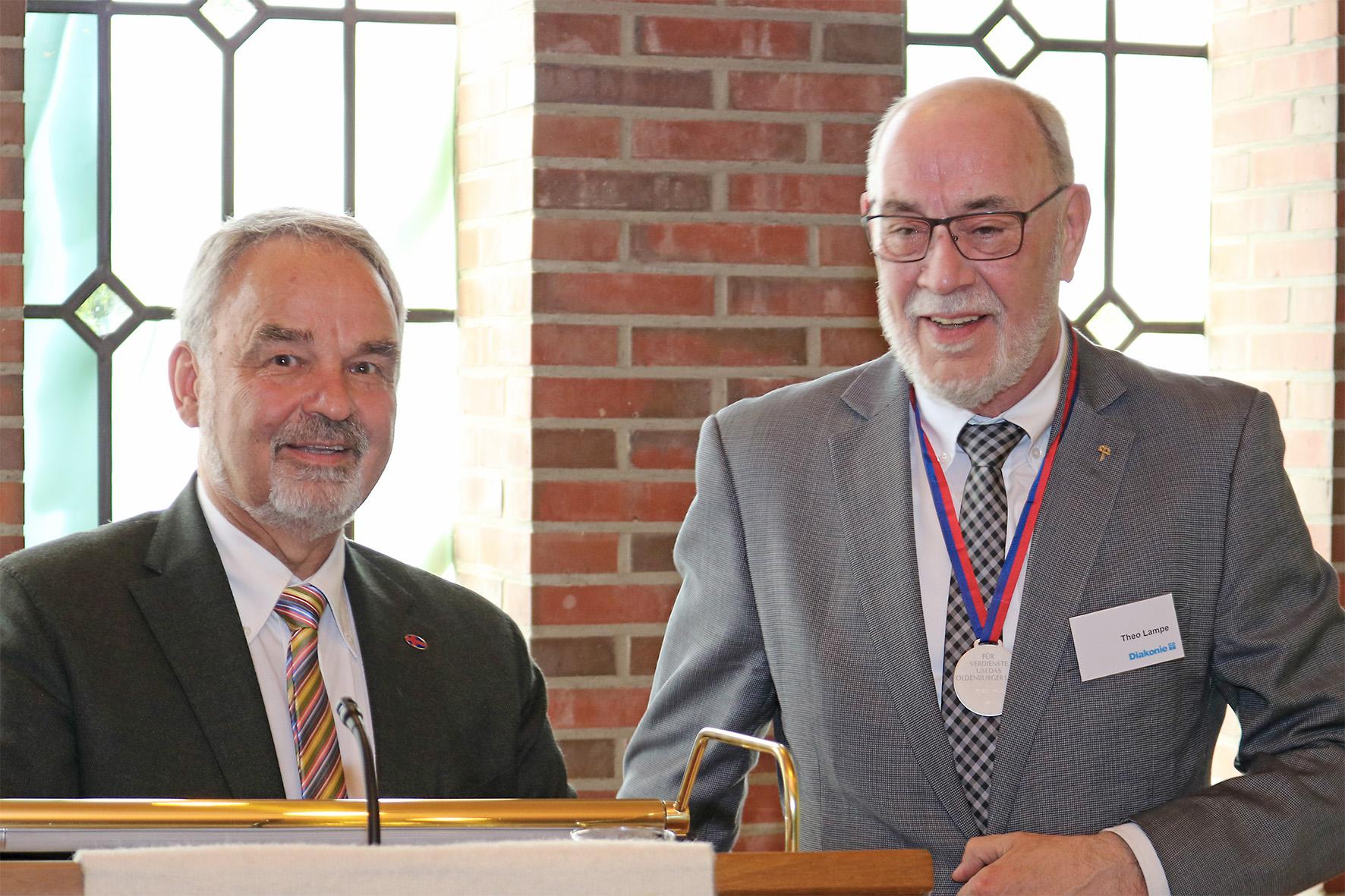 Oldenburg, 17. Mai 2017 - Vor der Diakonischen Konferenz in Oldenburg hat der Präsident der Oldenburgische Landschaft, Thomas Kossendey, dem langjährigen Diakonie-Mitarbeiter und Migrationsfachmann Theo Lampe die Landschaftsmedaille verliehen. Lampe hat sich beinahe vier Jahrzehnte lang in der Diakonie sozial engagiert und sich besonders in der Migrations-, Integrations- und Flüchtlingssozialarbeit große Verdienste erworben.