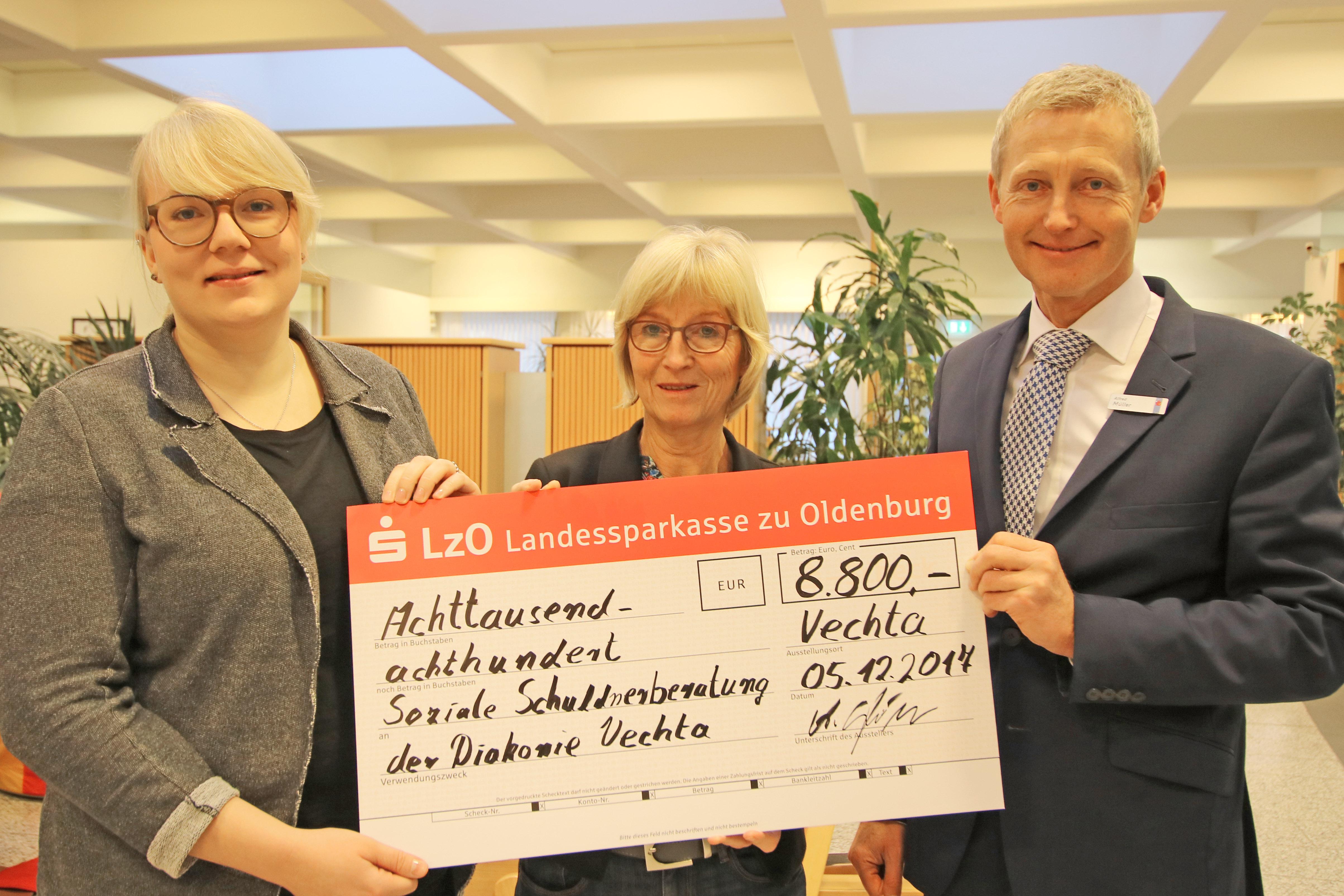 Vechta, 05.12.2017 – Franziska Mües und Margret Reiners-Homann von der Diakonie in Vechta danken der Landessparkasse zu Oldenburg für die Unterstützung der Schuldnerberatung in Vechta. Alfred Müller, LzO-Regionaldirektor Firmenkunden Vechta überreichte der Diakonie einen Förderscheck in Höhe von 8.800 Euro aus Mitteln des Lotteriespiels „Sparen + Gewinnen“. Der Sparkassenverband Niedersachsen unterstützt die Schuldnerberatungsstellen der Diakonie, damit sich Menschen an eine Beratungsstelle in ihrer Nähe wenden können. Überschuldete brauchen die Unterstützung einer vorurteilsfreien Beratung, betonte die Diakonie. Denn Überschuldung entsteht meist bei Einschnitten im Lebenslauf. Bei jedem Zweiten ist Arbeitslosigkeit ein Auslöser für Überschuldung. Auch Krankheit, Scheidung oder Trennung führen in die finanzielle Notlage. Fast jeder Zweite hat dann weniger als 900 Euro netto. Also weniger als das Existenzminimum, berichtet das statistische Bundesamt. In Vechta sind zahlreiche Familien in der Beratung, berichtet Franziska Mües, die wegen eines sehr geringen Arbeitseinkommens von um die 1.100 Euro in die Überschuldung geraten sind.