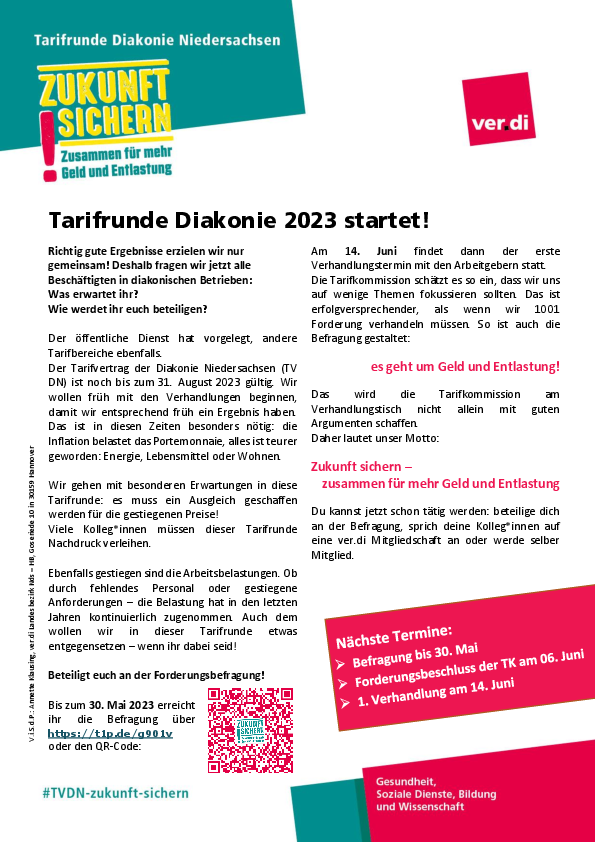 die für uns verhandelnde Gewerkschaft ver.di startet in die Tarifrunde 2023 mit einer Forderungsbefragung. Um teilzunehmen und eure Arbeitsbedingungen mitzugestalten könnt ihr über die anhängende PDF alle wichtigen Infos sowie den Link / QR Code zur Befragung nutzen.