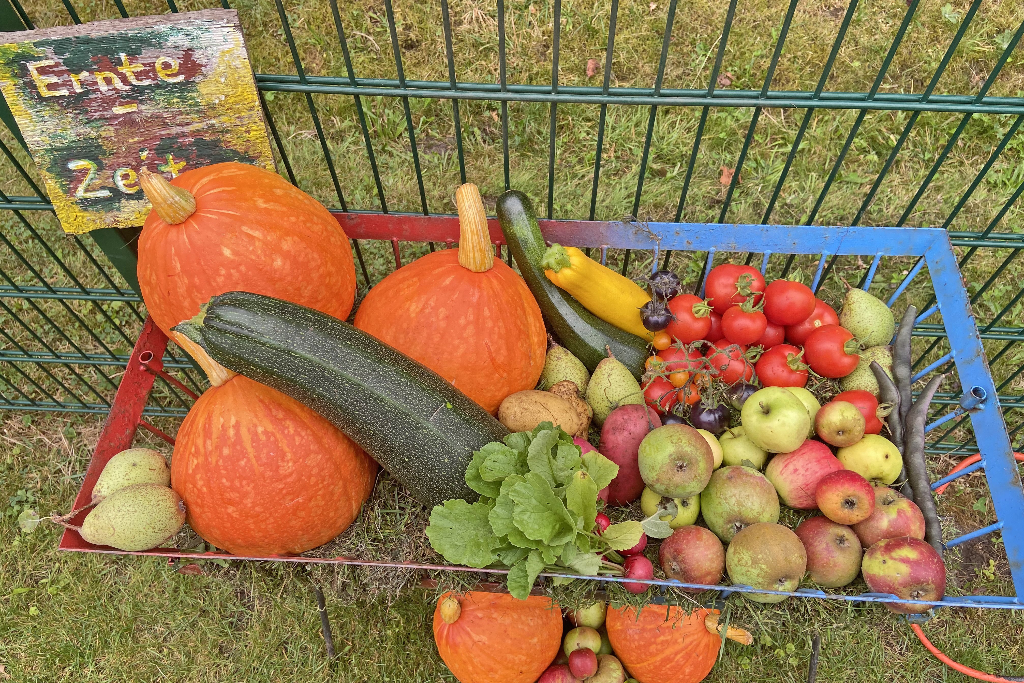 Oldenburg, 12.9.2022 – Stolz führen die Teilnehmer des Projektes Querbeet die Besucher beim Tag der offenen Tür durch die zusammengelegten Parzellen des Kleingartens im Kleingartenverein am Pophankenweg. Noch immer wachsen Gurken, Zucchini, Kürbisse und Bohnen in den Beeten und es wird fleißig geerntet. Viele Teilnehmer haben eigene Beete, um die sie sich alleine kümmern. „Wir haben dieses Jahr 15 Kilo Karotten geerntet“, berichtet ein Teilnehmer stolz. Ein anderer erzählt, dass er so viele Gurken ernten konnte, dass er sie teilweise verschenken musste.