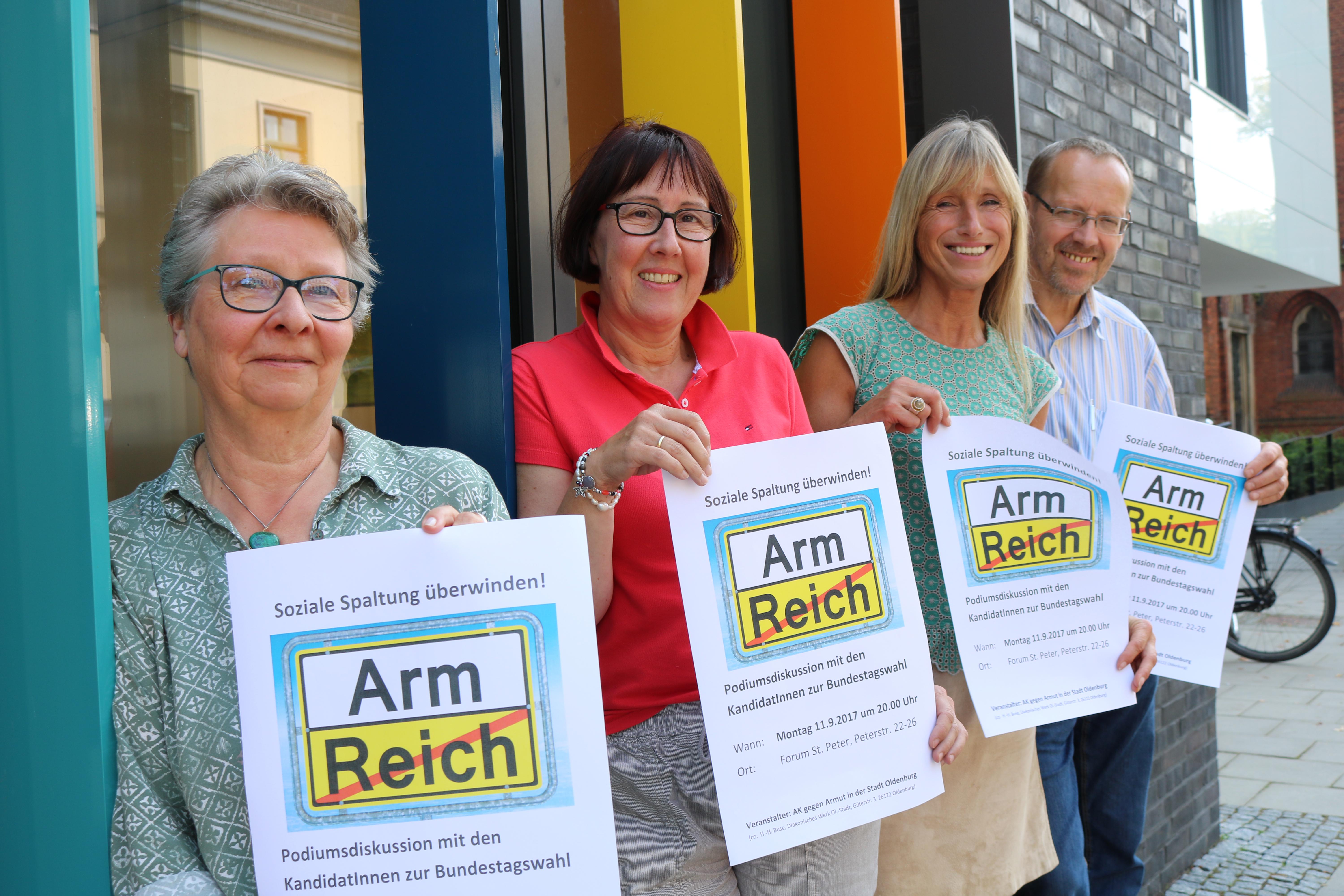 Den über 30 sozialen Initiativen, Einrichtungen und Diensten, die sich im Arbeitskreis gegen Armut zusammengefunden haben, ist es wichtig, dass das Thema soziale Gerechtigkeit im Wahlkampf und danach nicht unter den Tisch fällt, erläutert Heinz-Hermann Buse vom Diakonischen Werk Oldenburg Stadt die Intention des Arbeitskreises. „Diese Themen sind für viele Menschen sehr wichtig. Wir wollen ihren Fragen Raum geben“, ergänzt Juditha Hellbusch von der Caritas. Deshalb haben auch die Besucher der Podiumsdiskussion die Möglichkeit, selbst Fragen an die Direktkandidaten zu stellen.