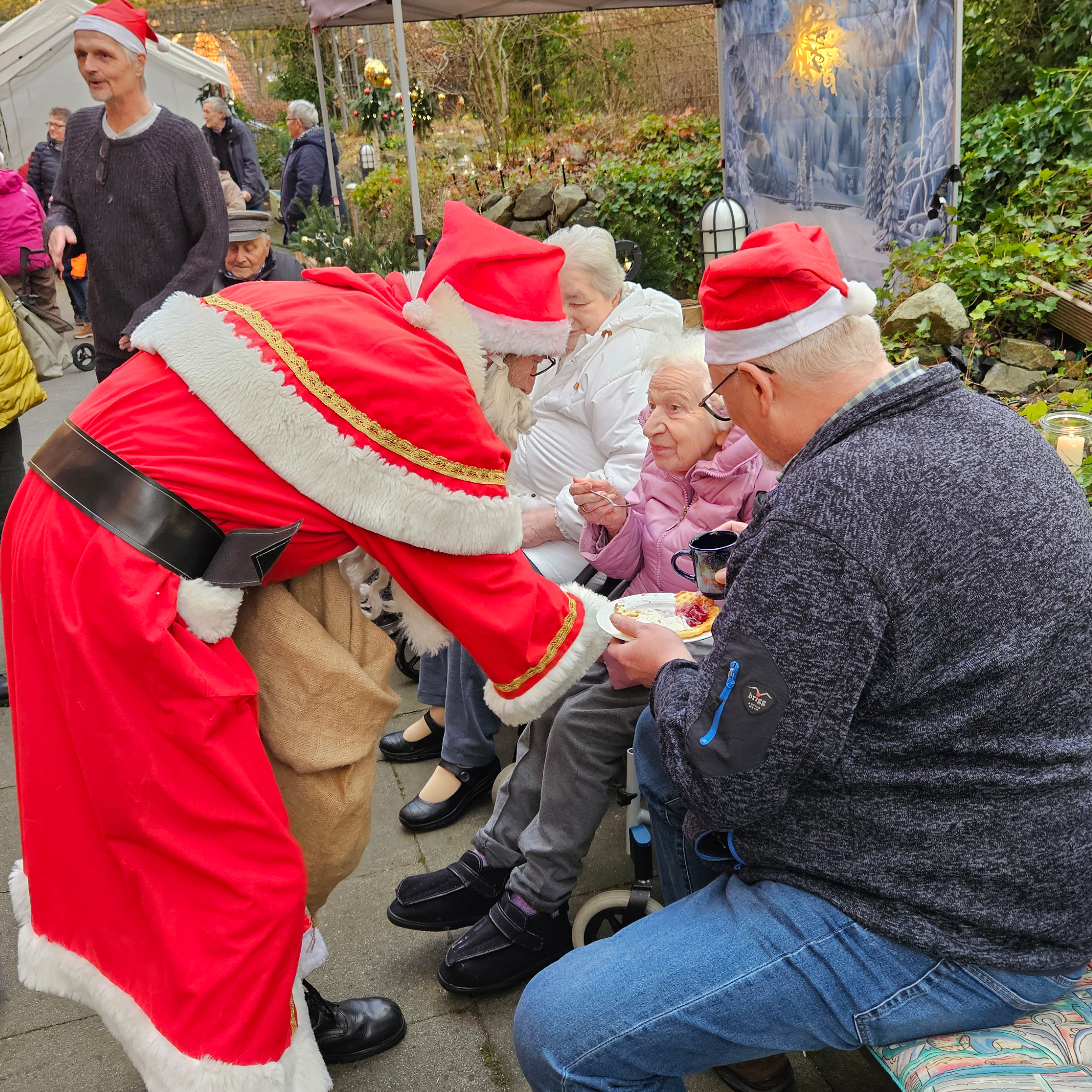 Esens, 1.12.2024 - Der Besuch des Weihnachtsmannes Weihnachtspony Püppi war für viele Besucher ein Höhepunkt beim "Wiehnachtstuun". Das Peter-Friedrich-Ludwig-Stift hatte zum stimmungsvollen Weihnachtsmarkt mit Basar, verschiedenen Speisen und Getränken sowie einer zauberhaften Gartenbeleuchtung eingeladen. Die Bewohner*innen und Besucher*innen genossen die weihnachtliche Stimmung, zu der auch ein Gitarrentrio beitrug.
